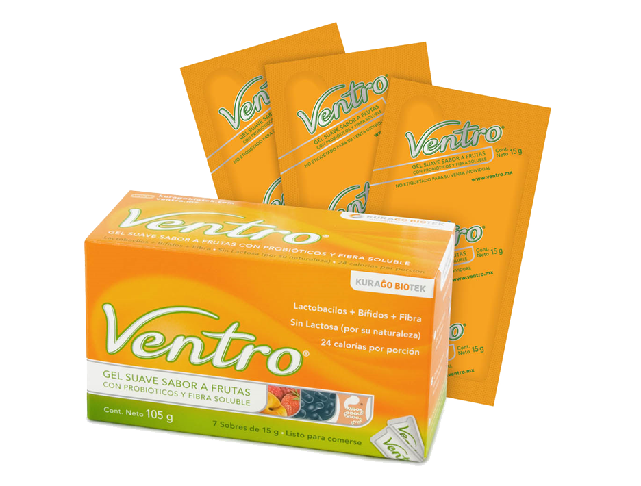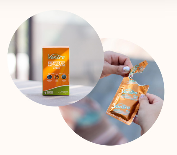 Con cada sobre de Ventro® consumirá dos mil millones de bacterias benéficas, fibra y vitaminas que le ayudarán día a día a tener una flora intestinal sana.